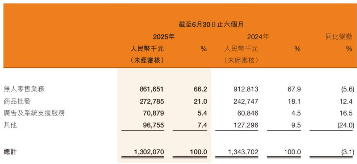 其中,2025年上半年来自无人零售业务收入8.62亿,较上年同期的9.12亿下5.6%;商品批发业务收入2.72亿,较上年同期的2.43亿元增长12.4%;
